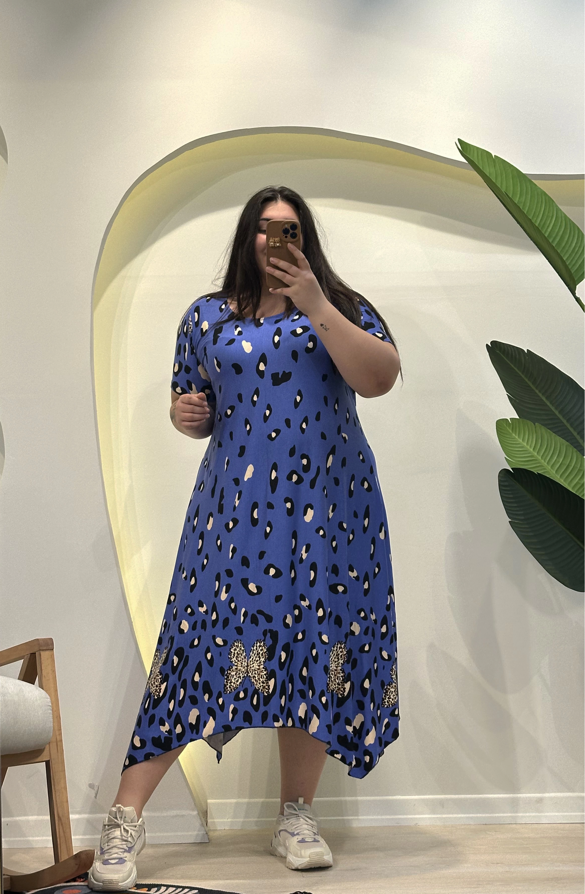 Asimetrik Esnek Penye Elbise - Mavi Leopar Desenli