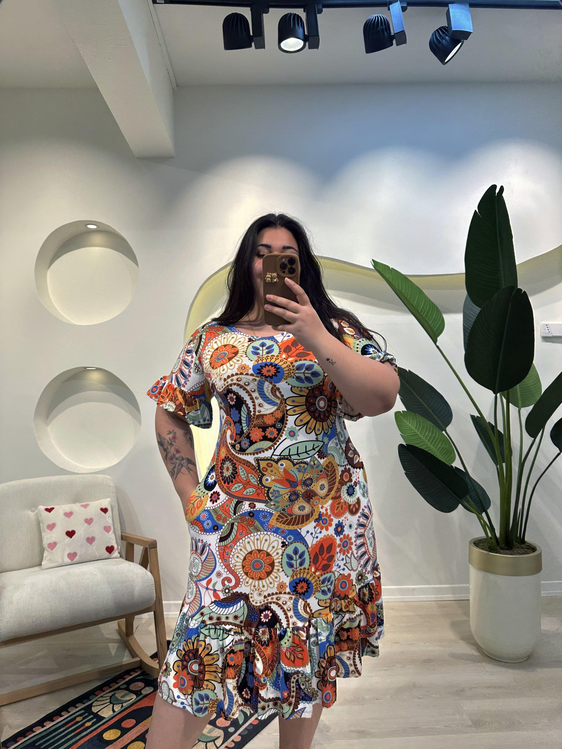 Fırfırlı Esnek Penye Elbise - Şal Desen