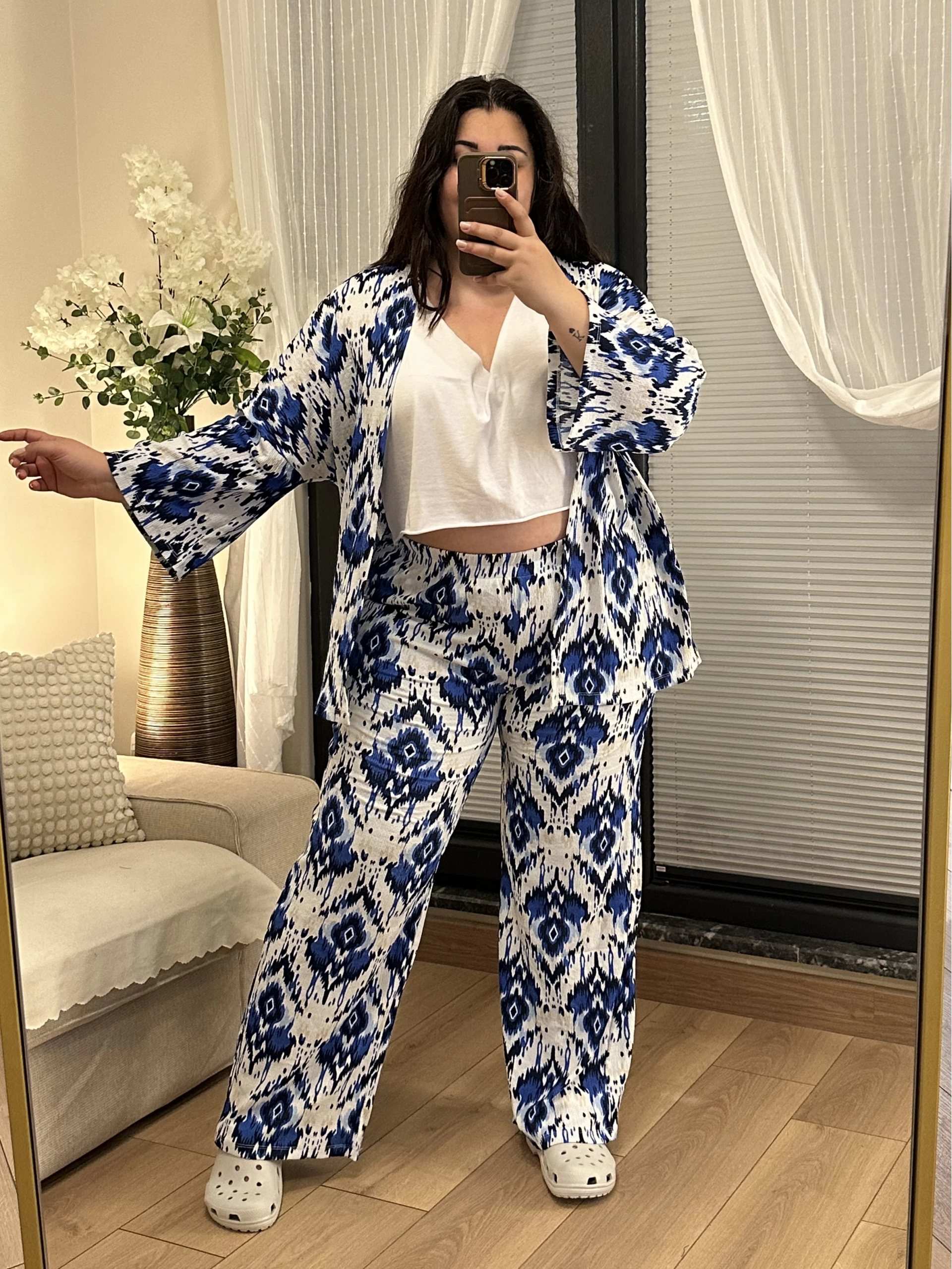 Geniş Kesim Bürümcük Palazzo Takım - Mavi Desenli