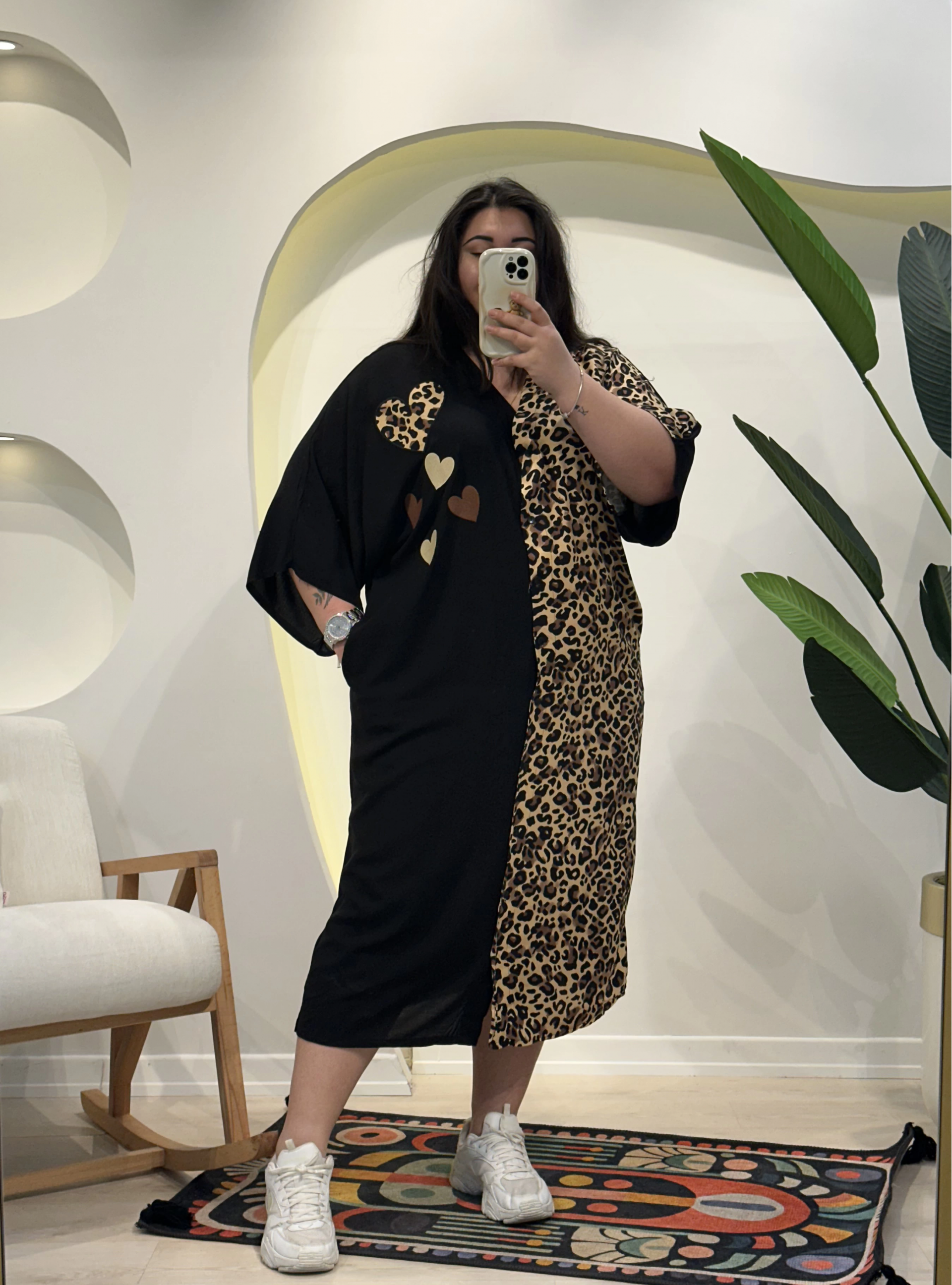 Geniş Kesim Düğme Detaylı Pamuklu Viskon Elbise - Kalpli Leopar