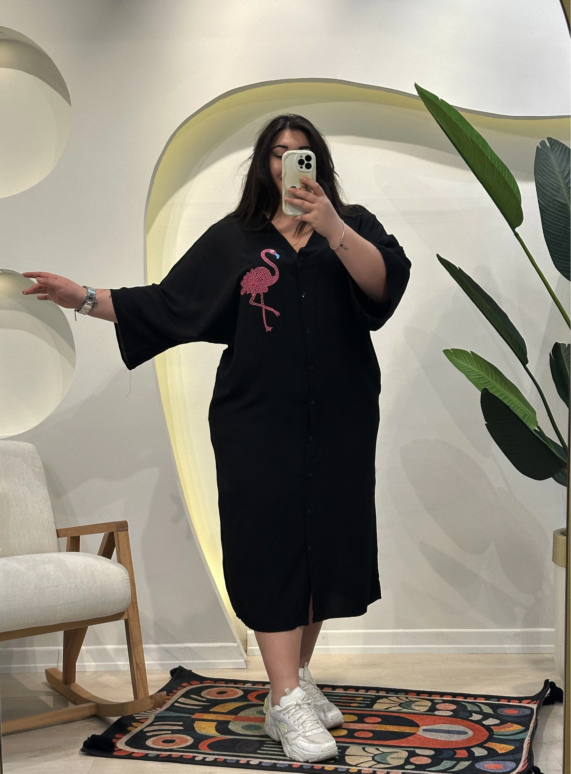 Geniş Kesim Düğme Detaylı Pamuklu Viskon Elbise - Siyah Flamingo
