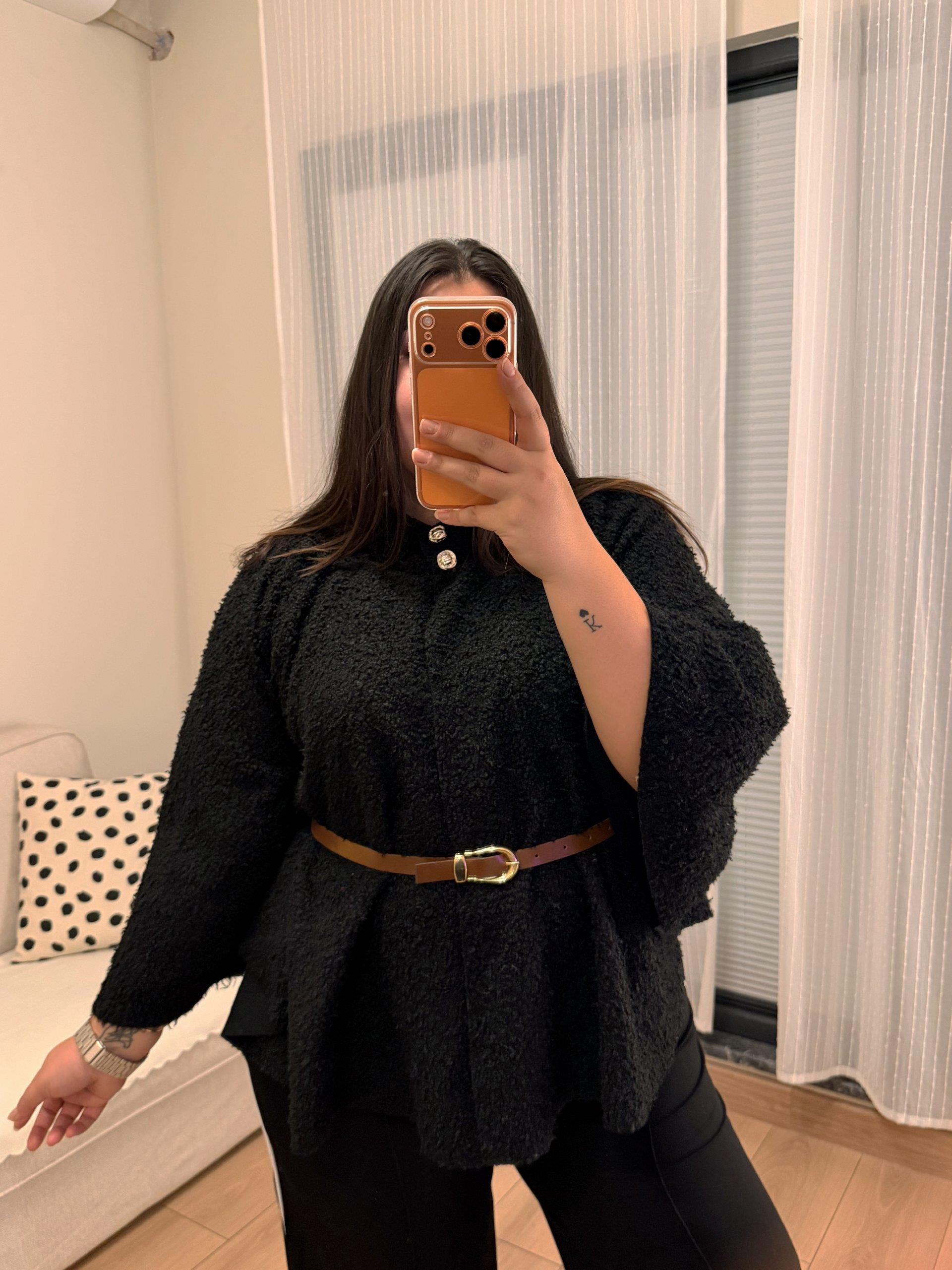 Geniş Kesim Kemerli Buklet Panço - Siyah