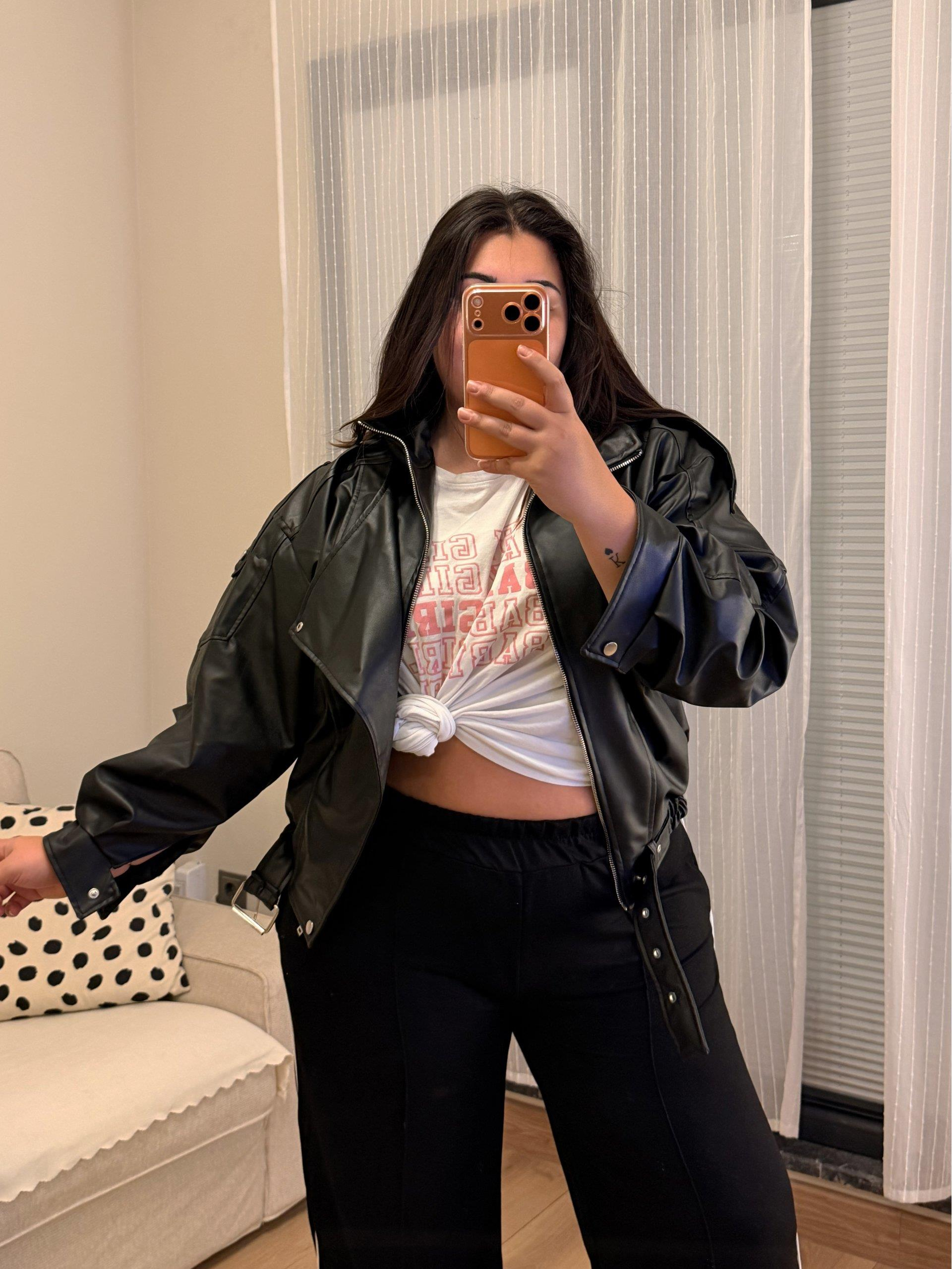 Geniş Kesim Lastik Detaylı Astarlı Deri Ceket - Siyah