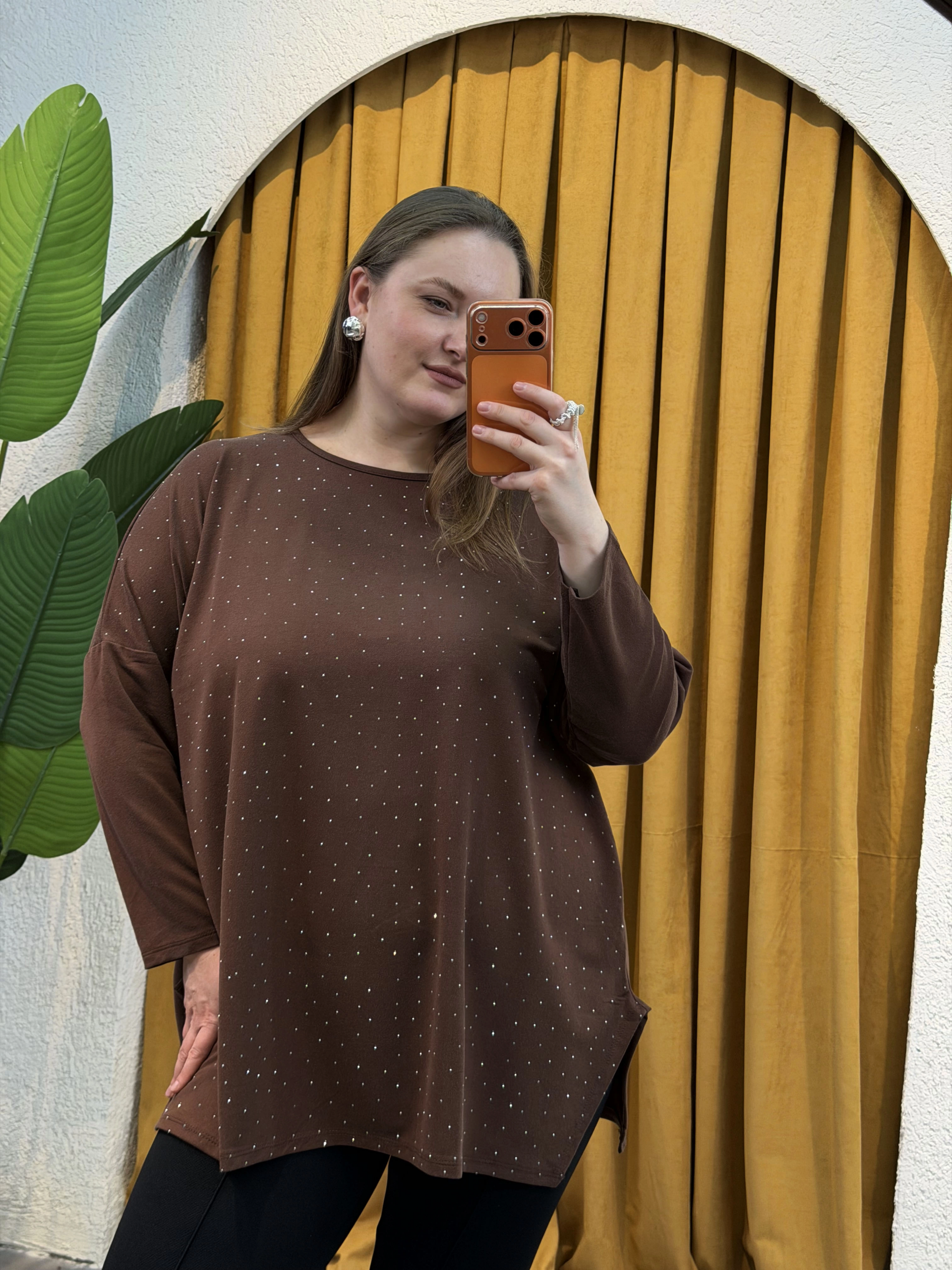 Modal Kumaş Esnek Taş Detaylı Bluz - Kahverengi