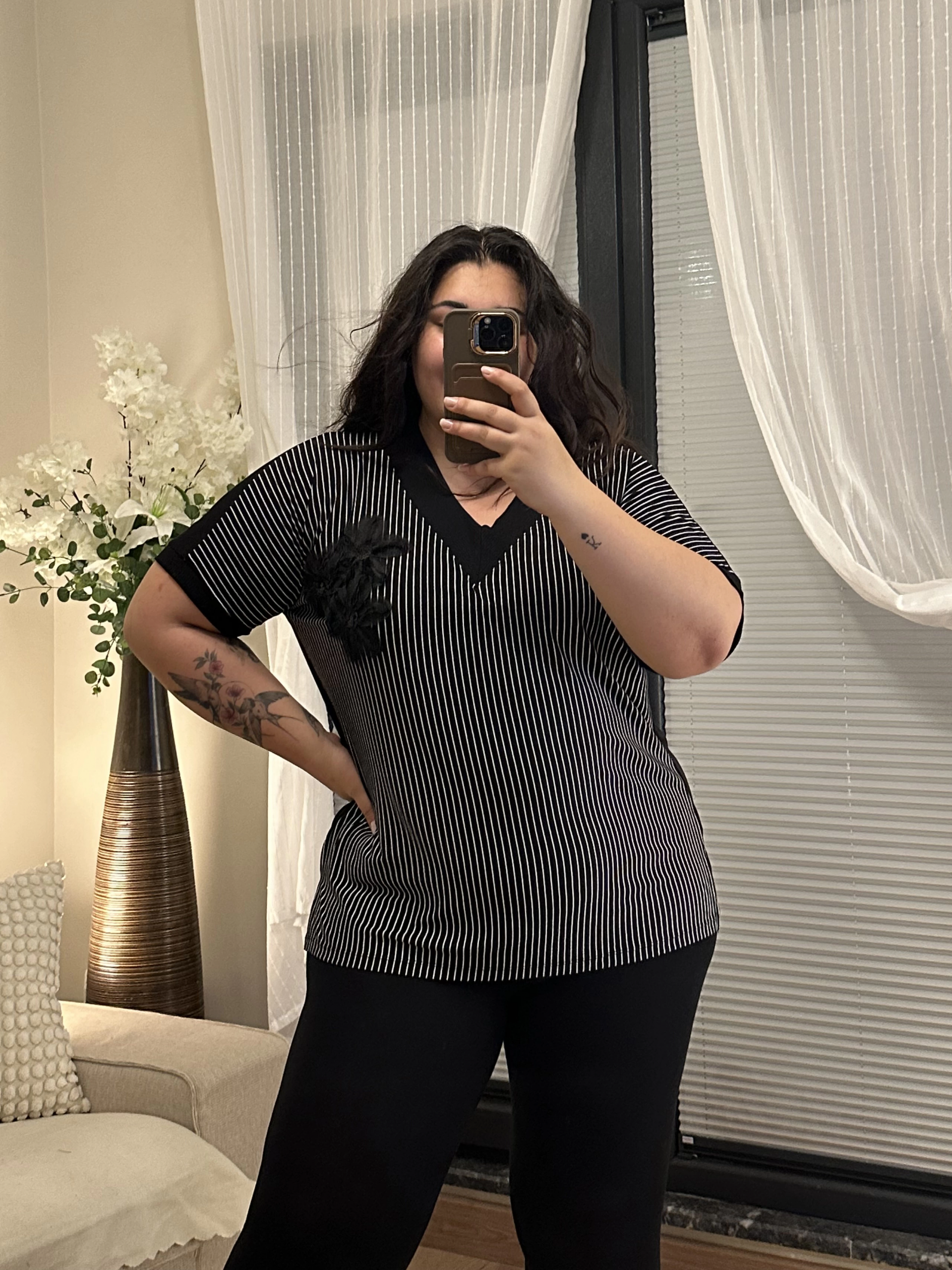 V Yaka Çiçek Detaylı Esnek Penye Bluz - Siyah