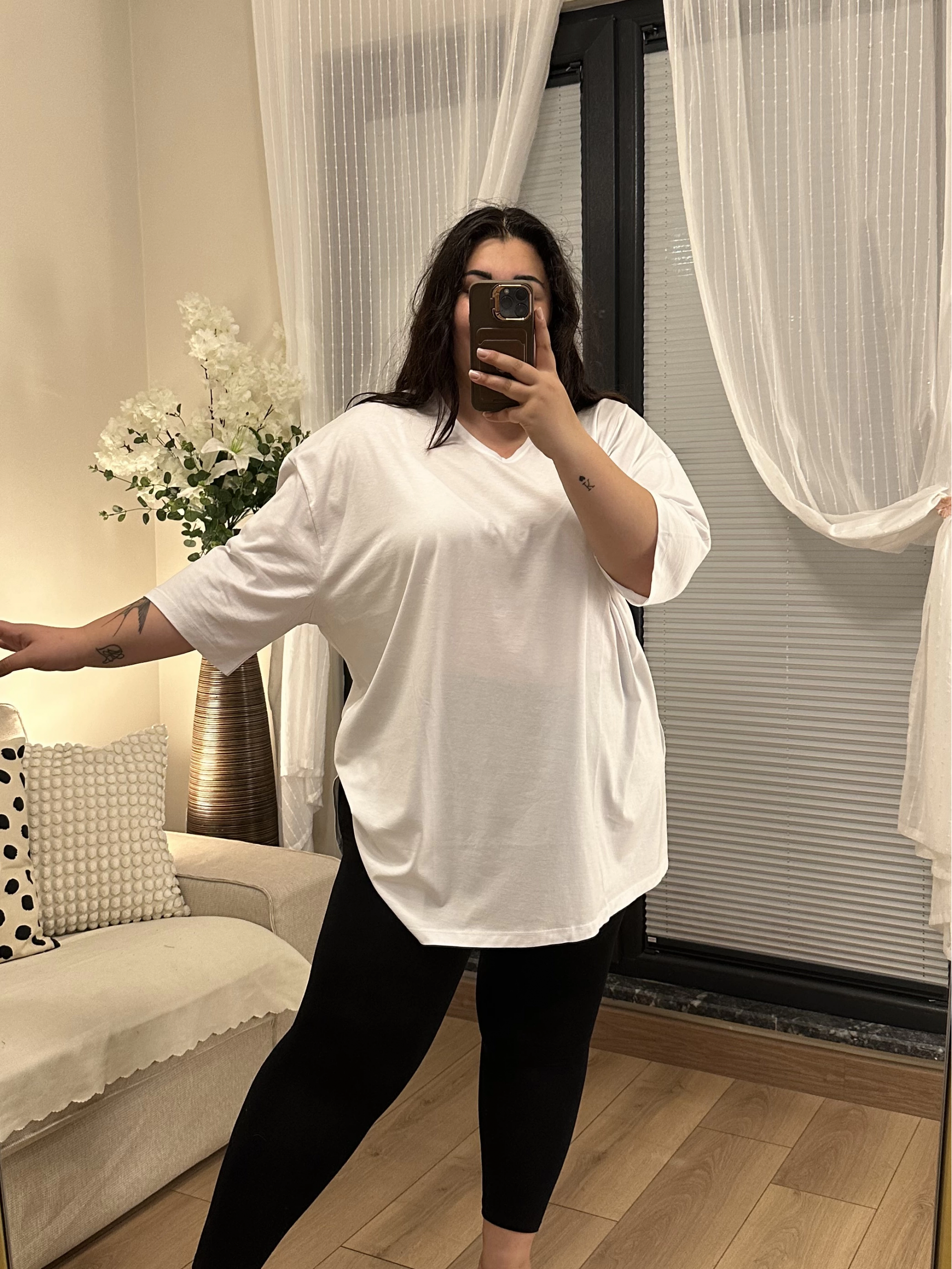 V Yaka Geniş Kesim Penye Tişört - Beyaz