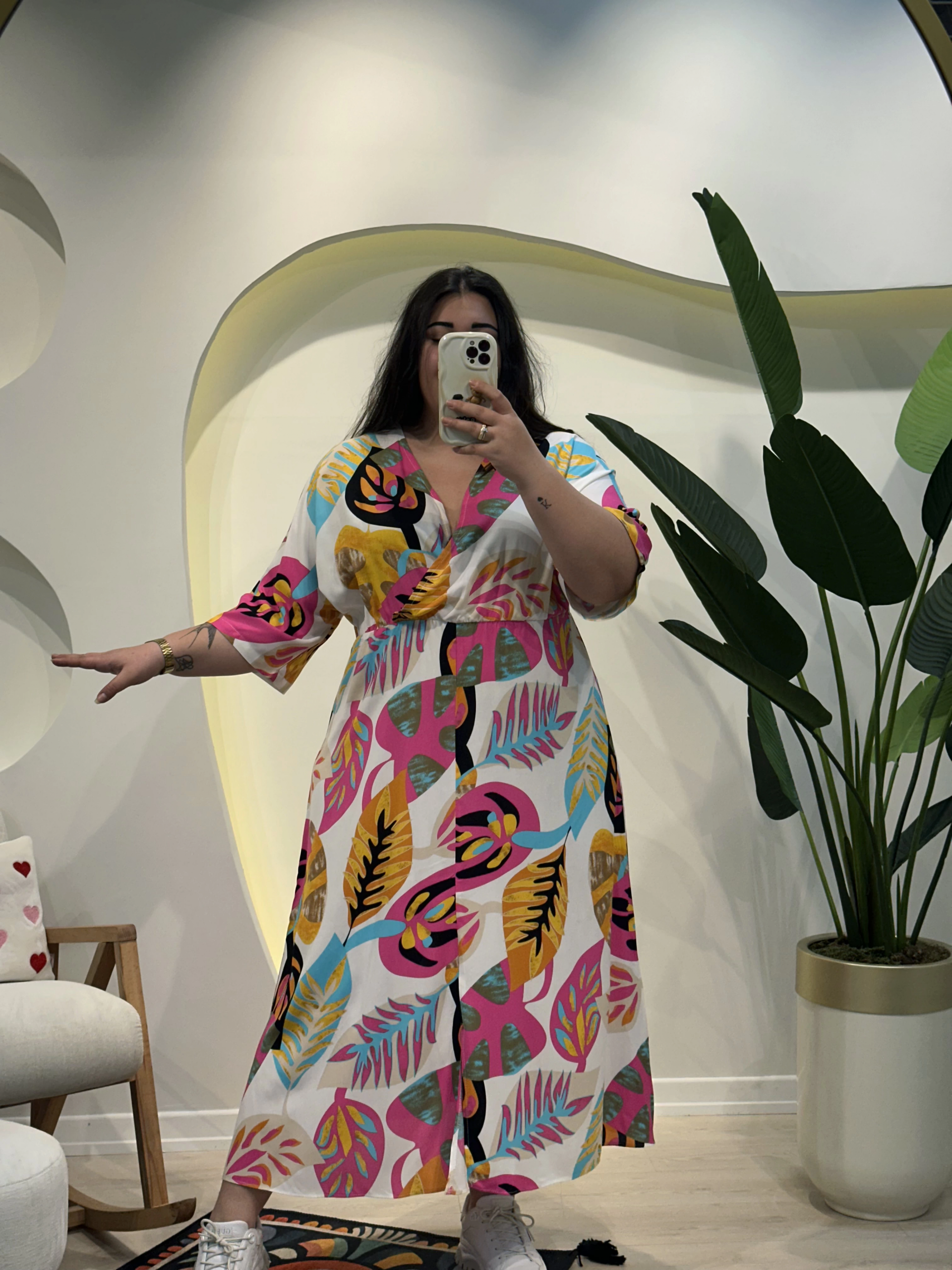 Geniş Kalıp , Dokuma Viskon Kumaş, Kruvaze Yaka Yarasa Kol Elbise