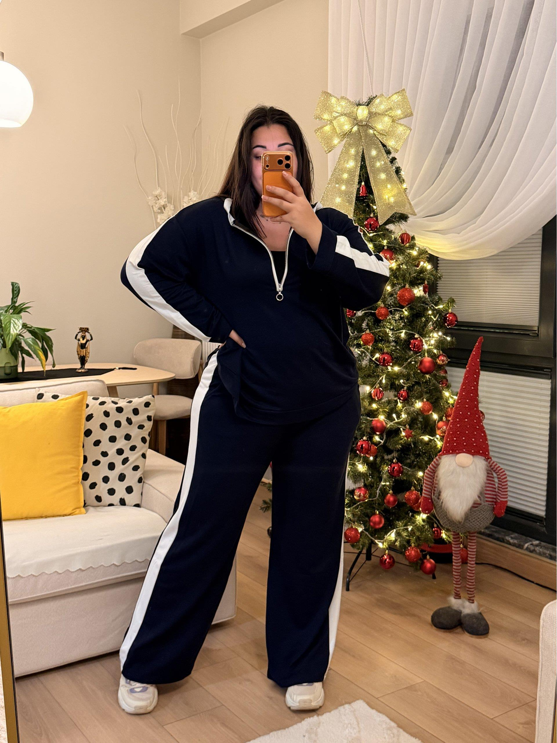 Yarım Fermuarlı Şeritli Kapüşonlu Takım - Lacivert