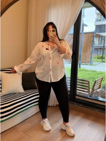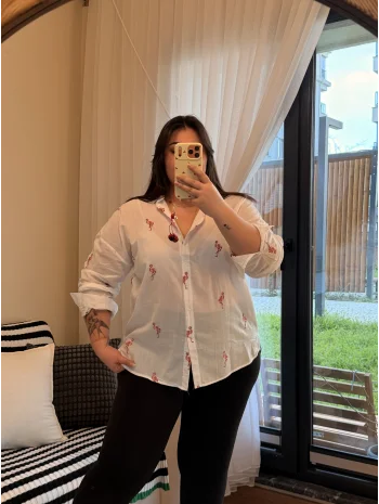 Geniş Kesim Pamuklu Gömlek - Flamingo Nakışlı