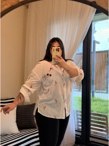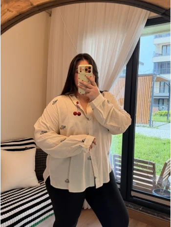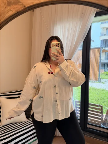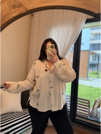 Geniş Kesim Pamuklu Gömlek - Kuş Detaylı Nakışlı