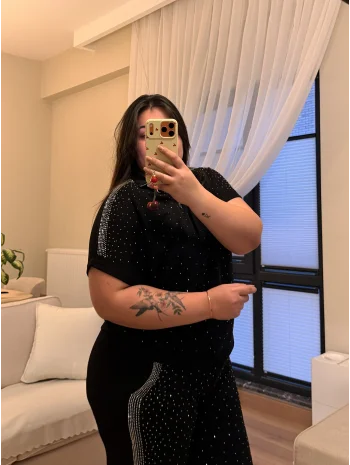 Geniş Kesim Taş Detaylı Penye Bluz - Siyah