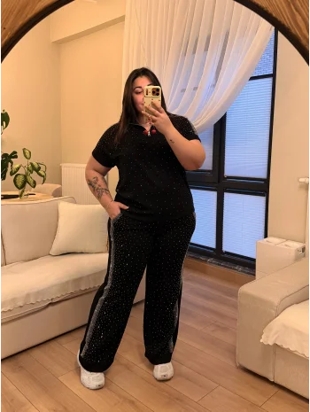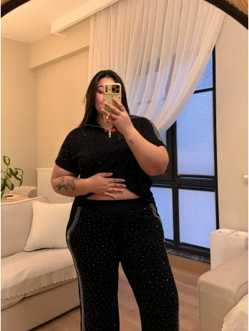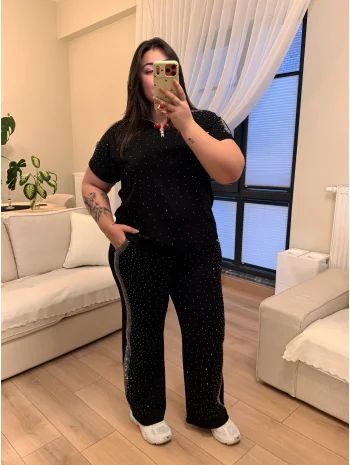 Fermuarlı Taş Detaylı Modal Takım - Siyah