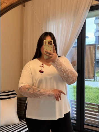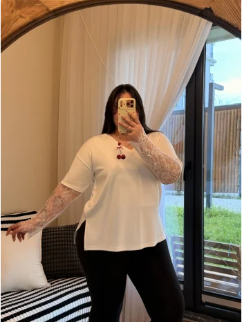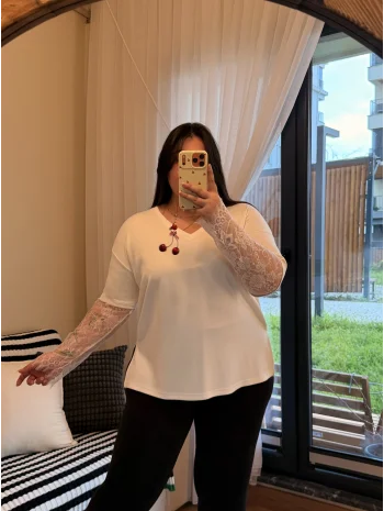 Dantel Detaylı V Yaka Modal Tişört - Beyaz