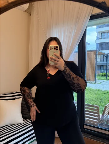 Dantel Detaylı V Yaka Modal Tişört - Siyah