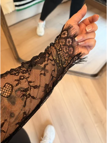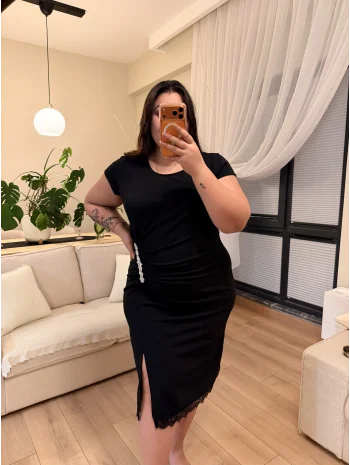 Kolları Dantel Detaylı Krep Elbise - Siyah