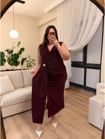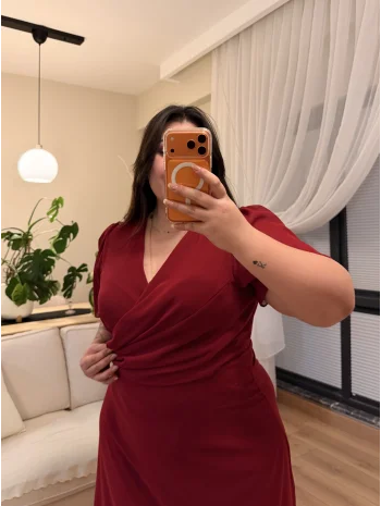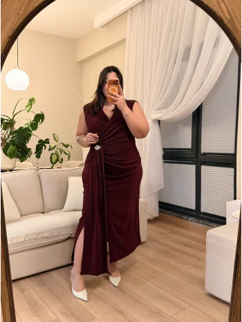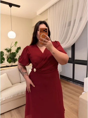 Kruvaze Yaka Tokalı Şifon Elbise - Bordo