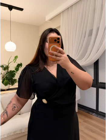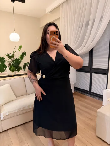 Kruvaze Yaka Tokalı Şifon Elbise - Siyah