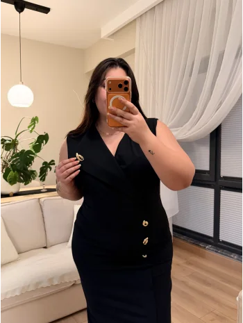 Sıfır Kol Düğme Detaylı Krep Takım - Siyah
