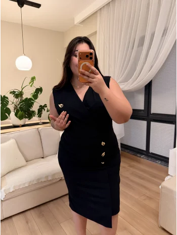 Kruvaze Yaka Gold Detaylı Krep Elbise - Siyah