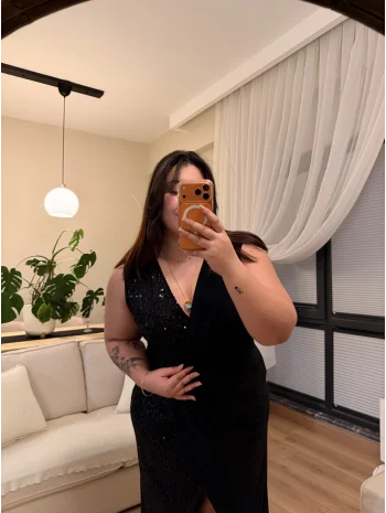 Maxi Boy Sıfir Kol Pul Payet Elbise - Siyah