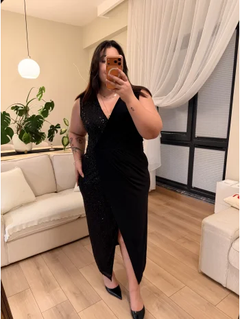 Kruvaze Yaka Pul Payet Astarlı Şifon Elbise - Siyah