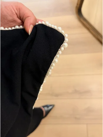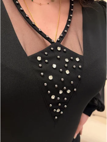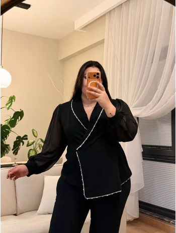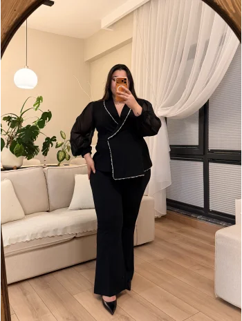 İnci Detaylı Kolları Şifon İkili Krep Takım - Siyah
