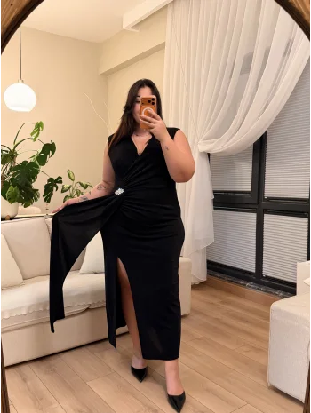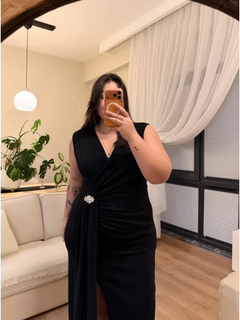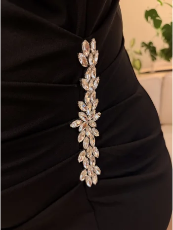 Drapeli Aksesuarlı Gece Elbisesi - Siyah