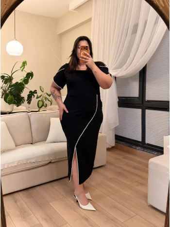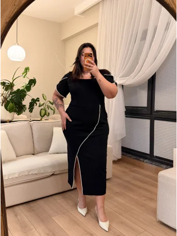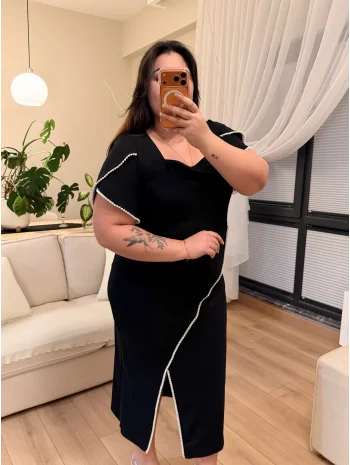 Kare Yaka Asimetrik İncili Krep Elbise - Siyah
