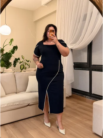 Kare Yaka Asimetrik İncili Krep Elbise - Lacivert