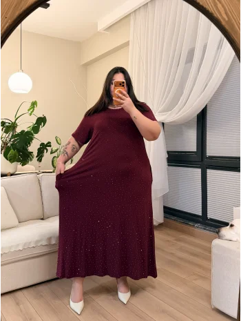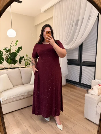 Geniş Kesim Cepli Taşlı Penye Elbise - Bordo