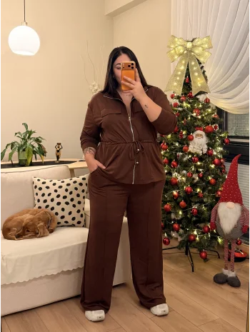 Büzgü Detaylı Cepli Modal Karışımlı Takım - Kahverengi