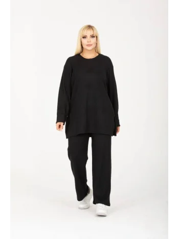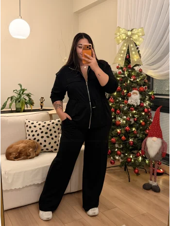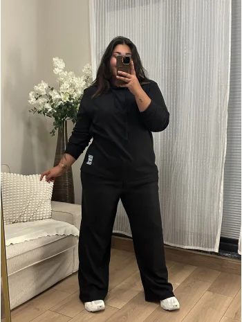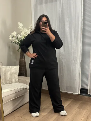 Geniş Kesim Esnek Kapüşonlu Fitilli Takım - Siyah