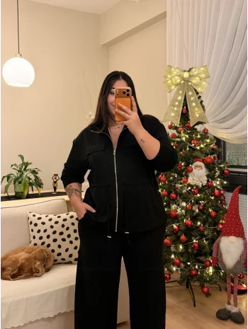 Büzgü Detaylı Cepli Modal Karışımlı Takım - Siyah