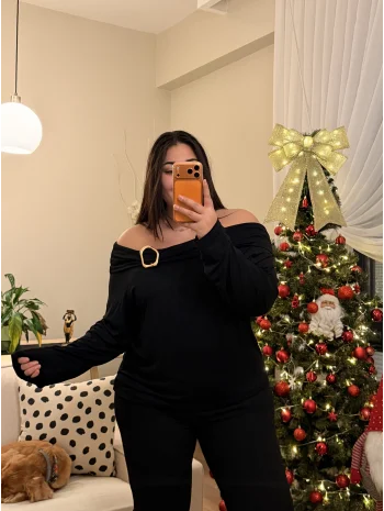 Madonna Yaka Broş Detaylı Esnek Modal Bluz - Siyah