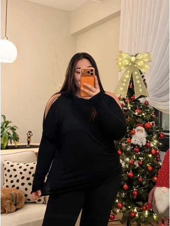 Geniş Kalıp Madonna Yaka Tunik Penye Bluz - Siyah