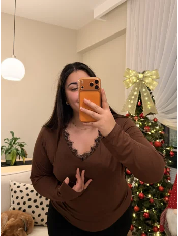 V Yaka Dantel Detaylı Esnek Modal Bluz - Kahverengi