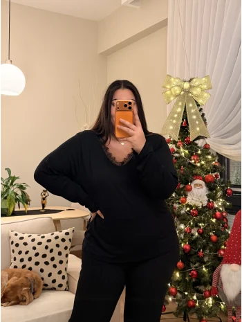 V Yaka Dantel Detaylı Esnek Modal Bluz - Siyah