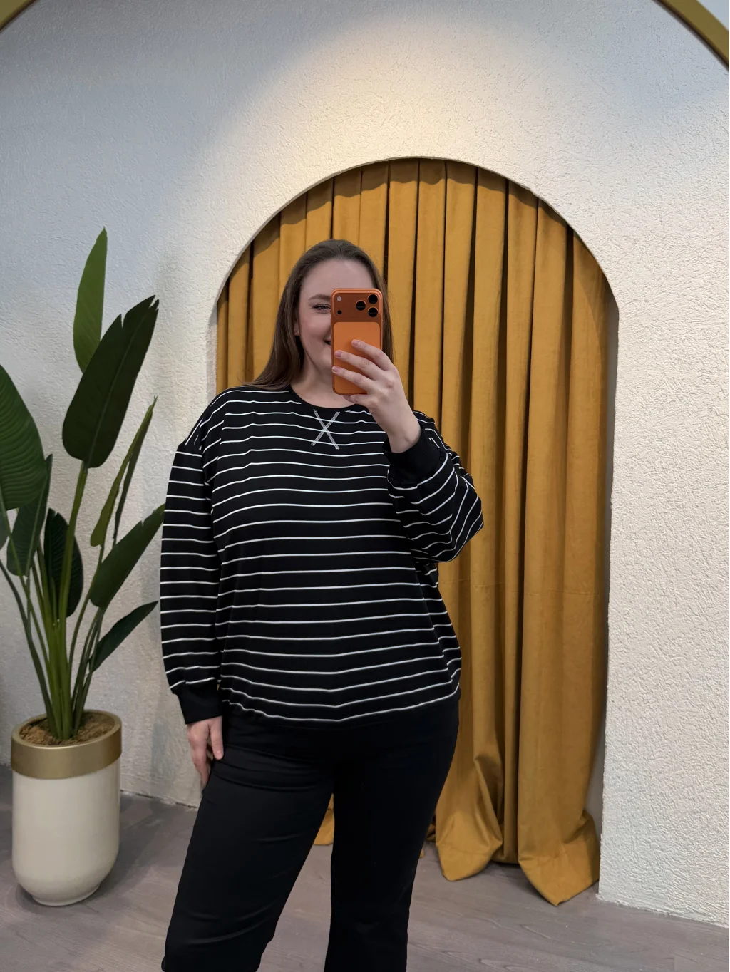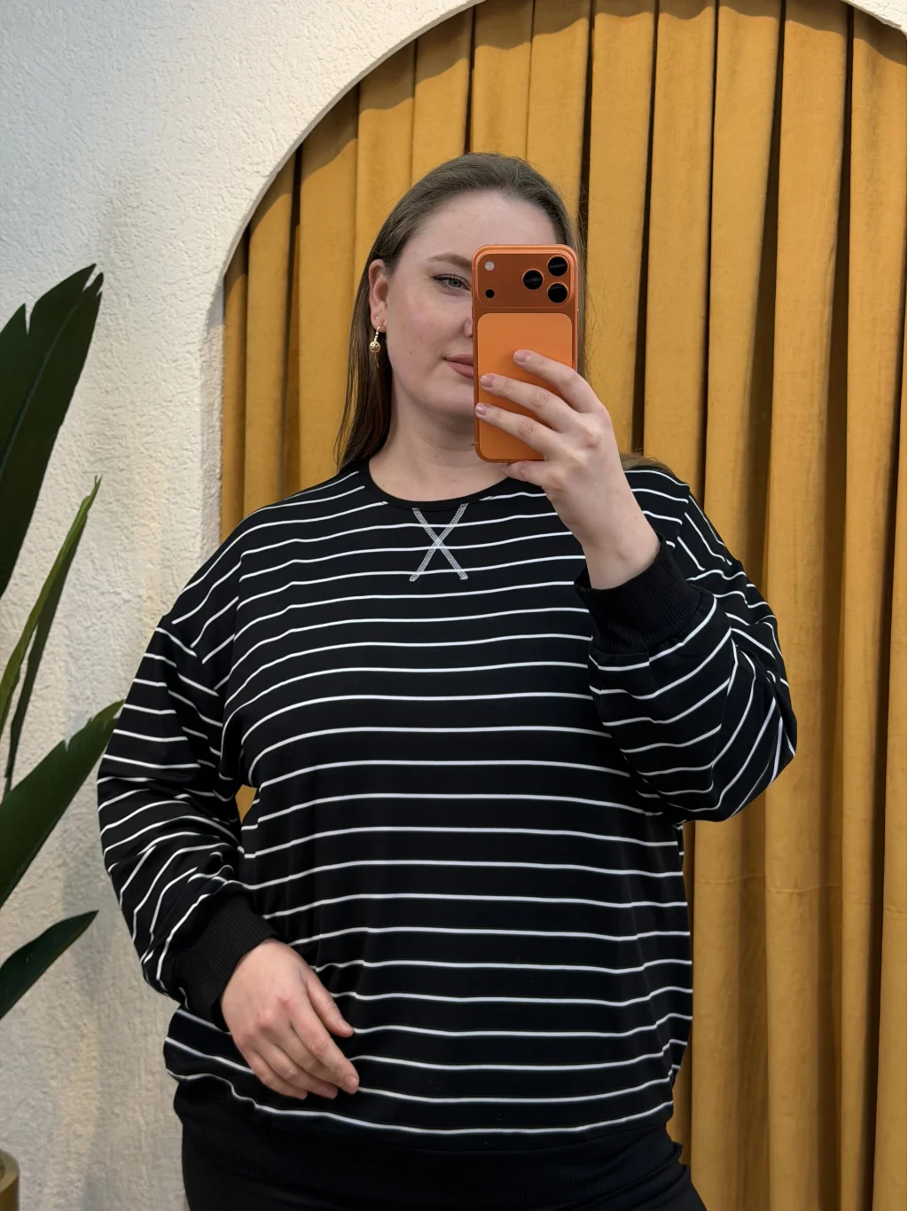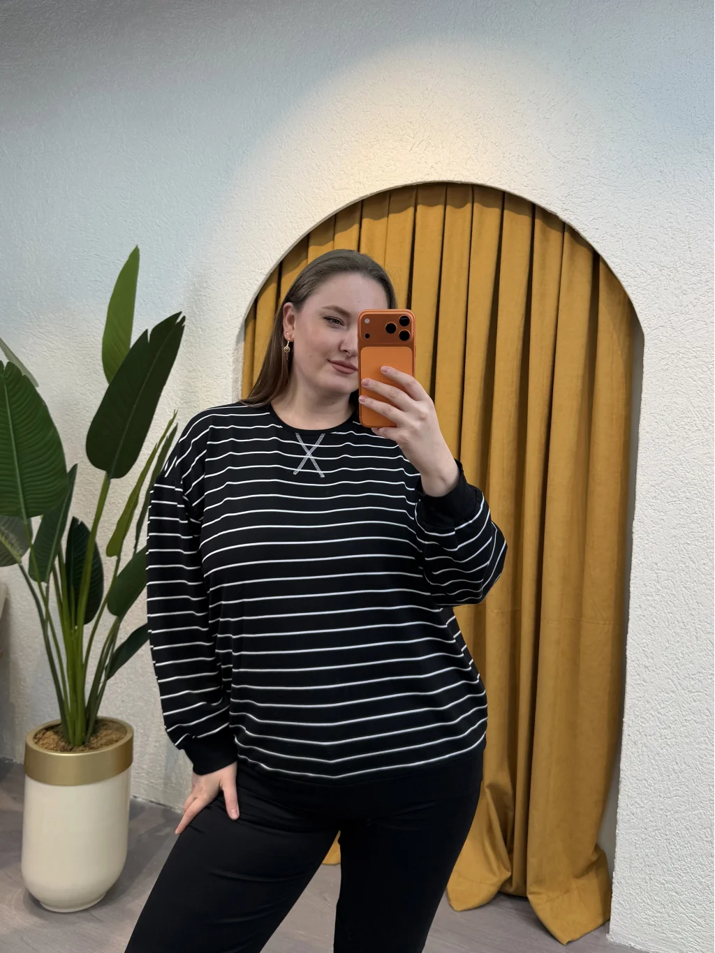 Sim Detaylı Geniş Kesim Penye Bluz - Siyah