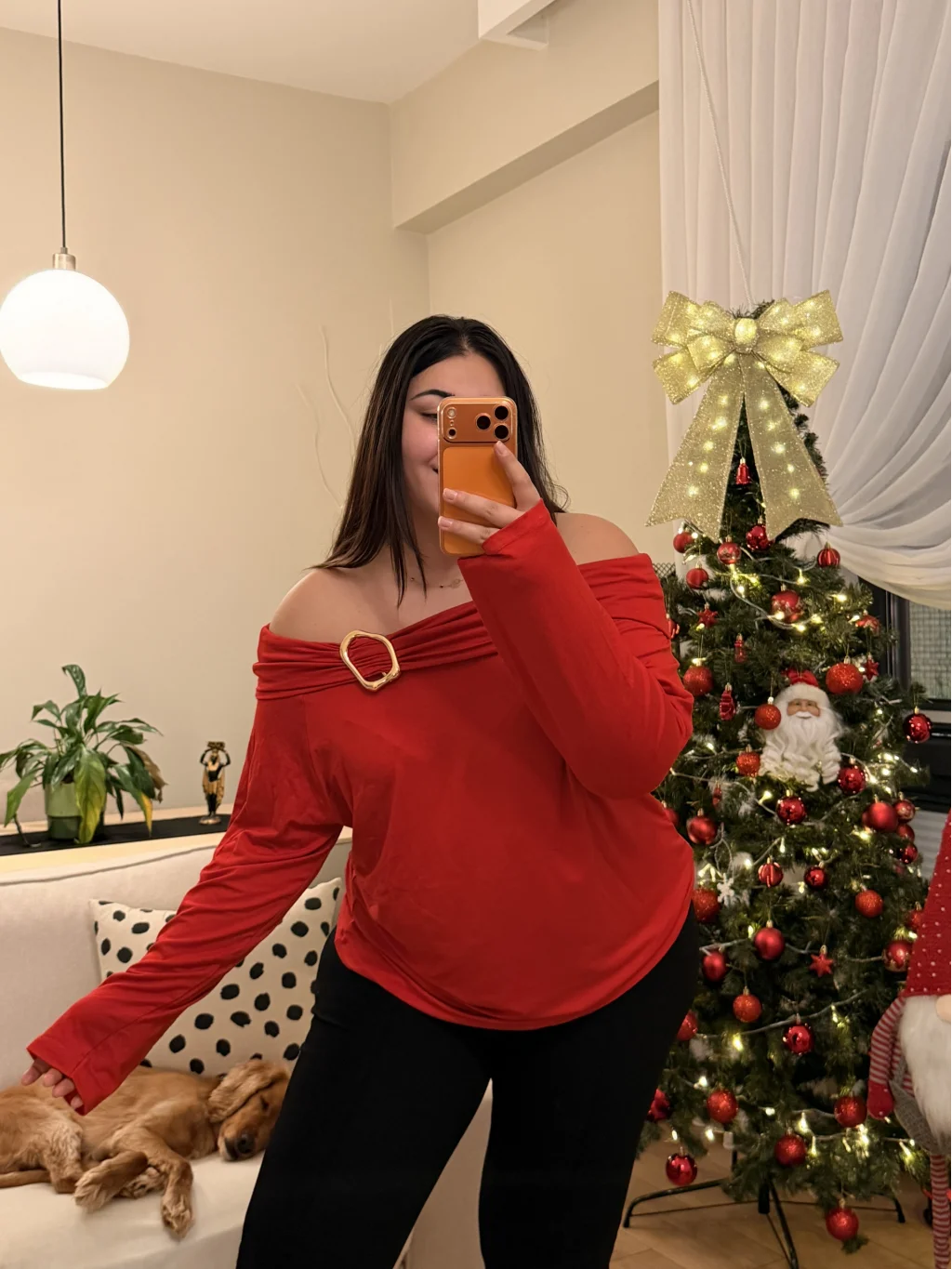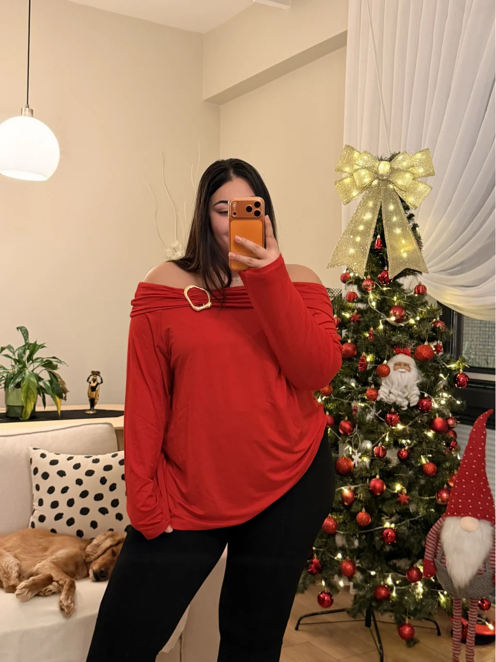 Madonna Yaka Broş Detaylı Esnek Modal Bluz - Kırmızı