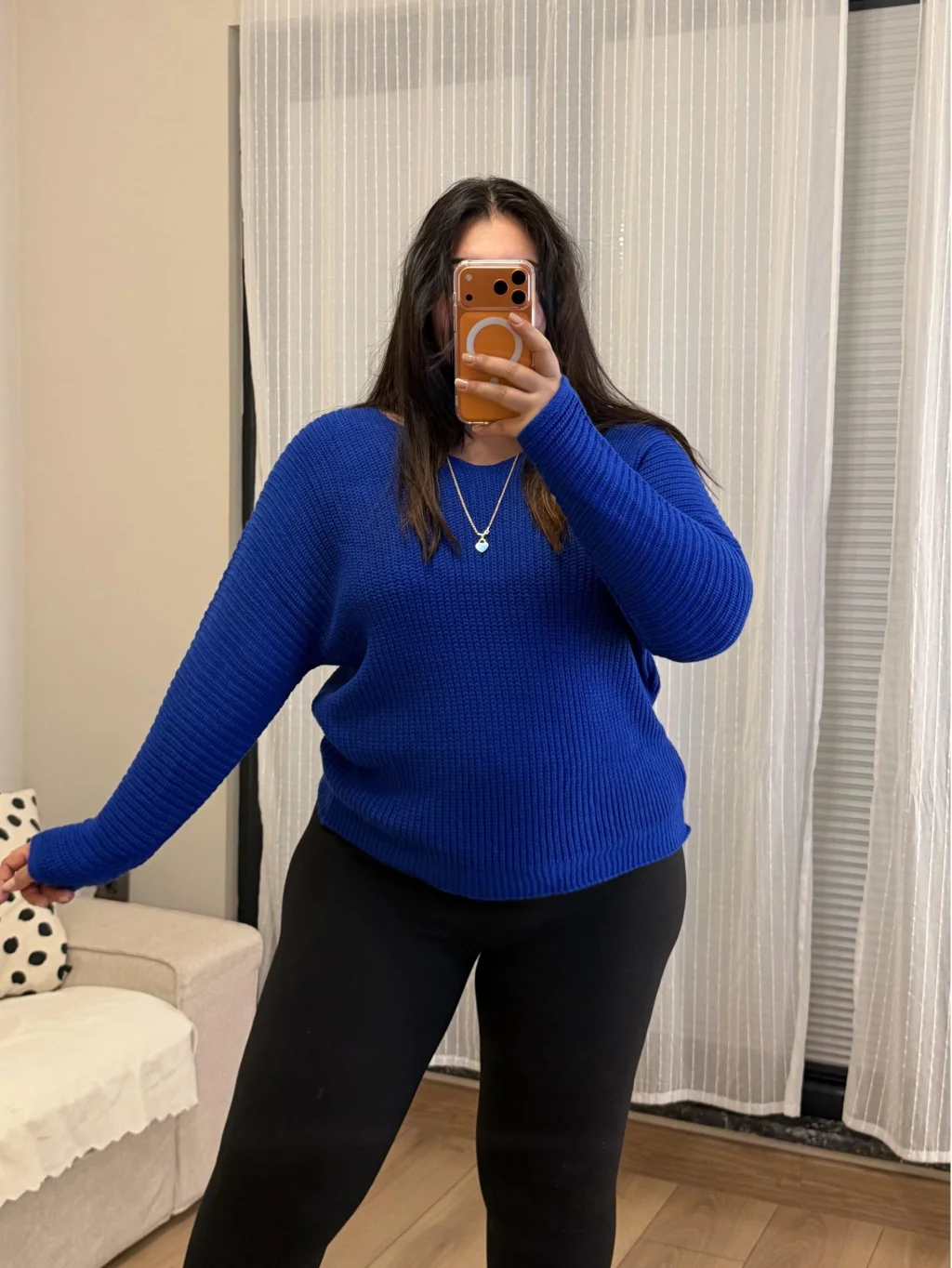 V Yaka Esnek Selanik Triko Bluz - Mavi