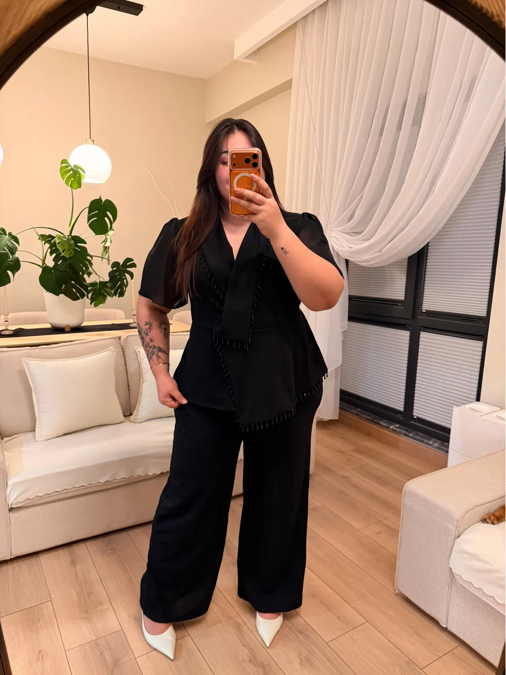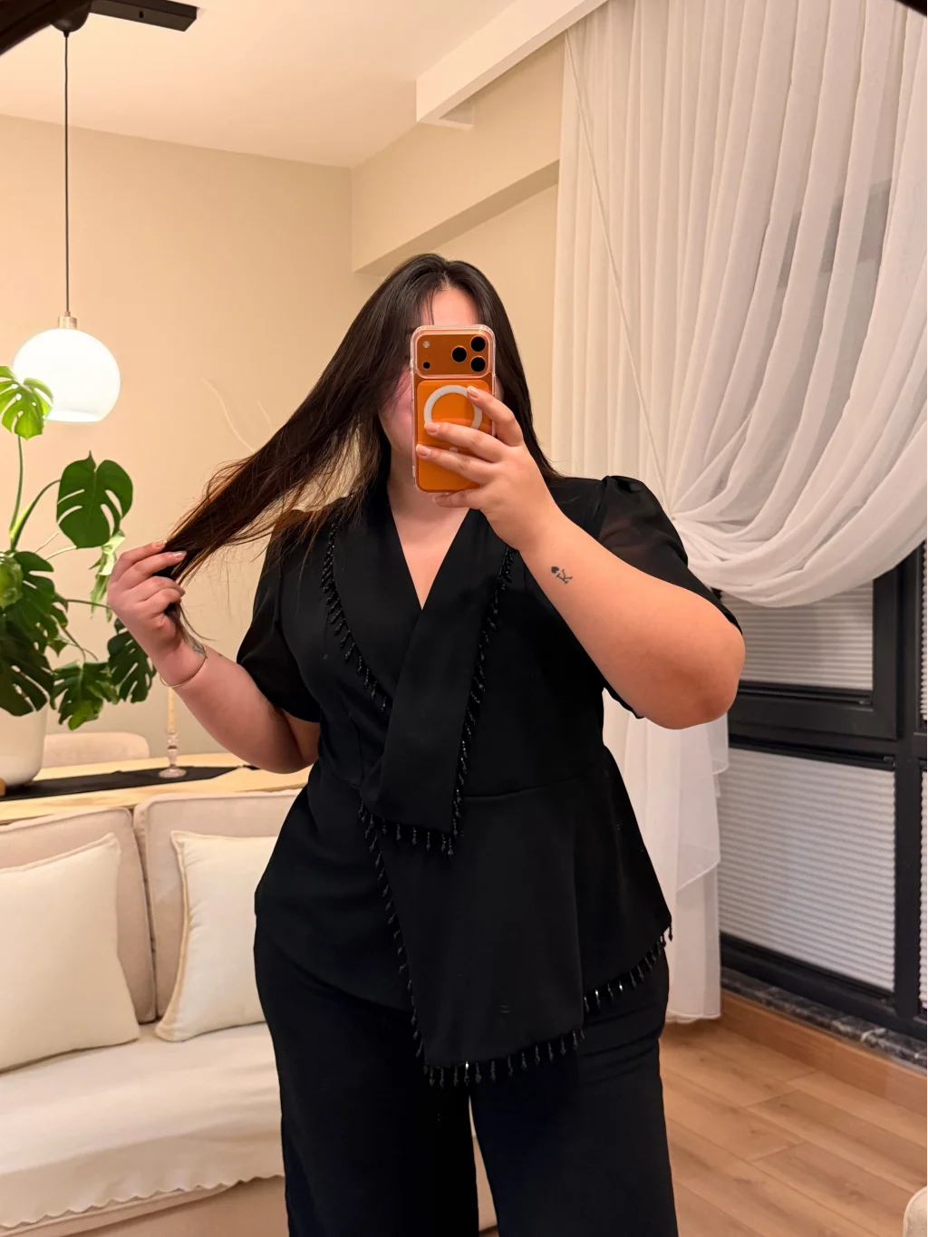 Boncuk Detaylı İkili Krep Takım - Siyah