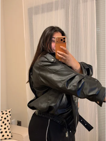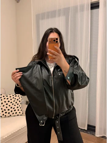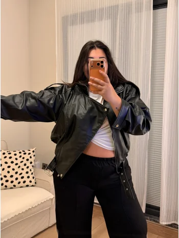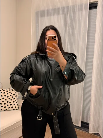 Geniş Kesim Lastik Detaylı Astarlı Deri Ceket - Siyah