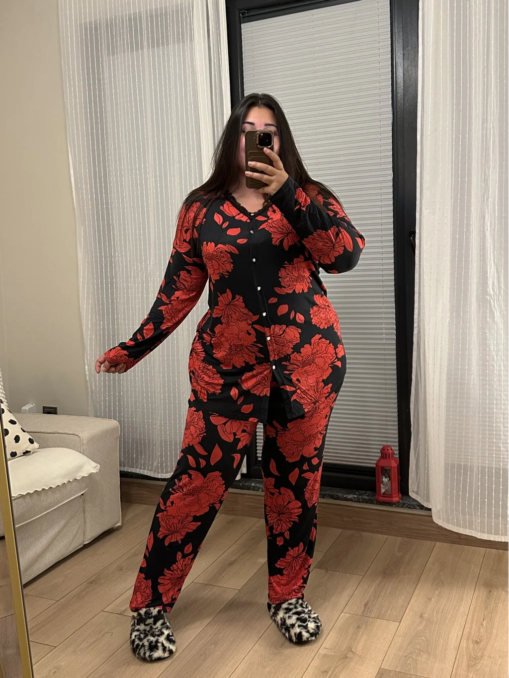 Pastel'in büyük beden kadın pijama takımı için dantel detaylı ve likralı kırmızı çiçekli tasarım.