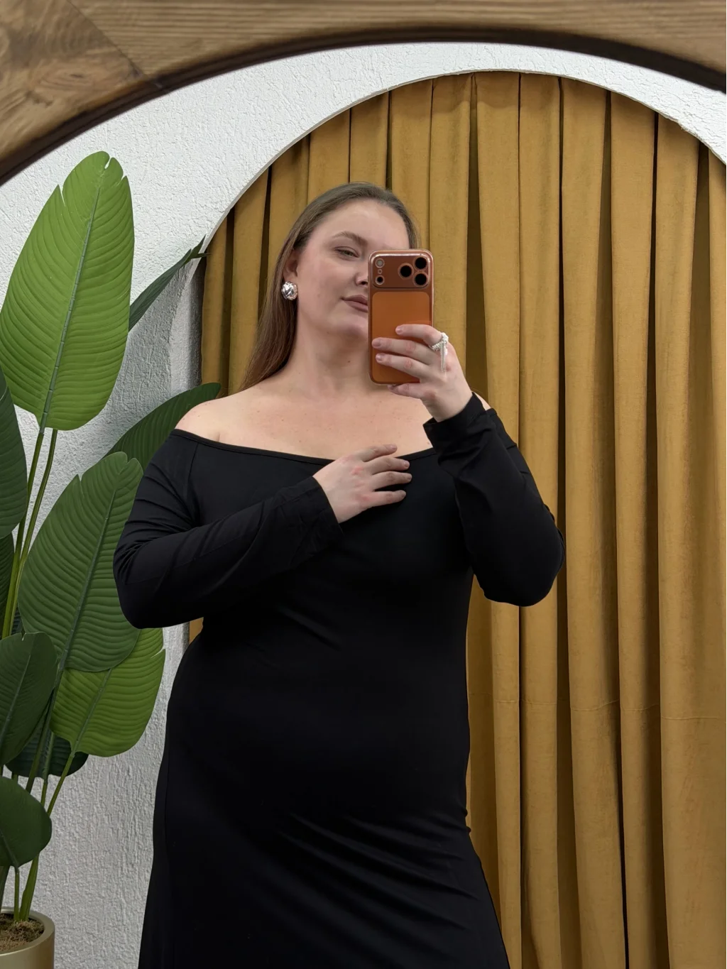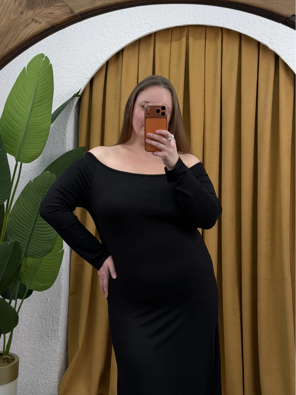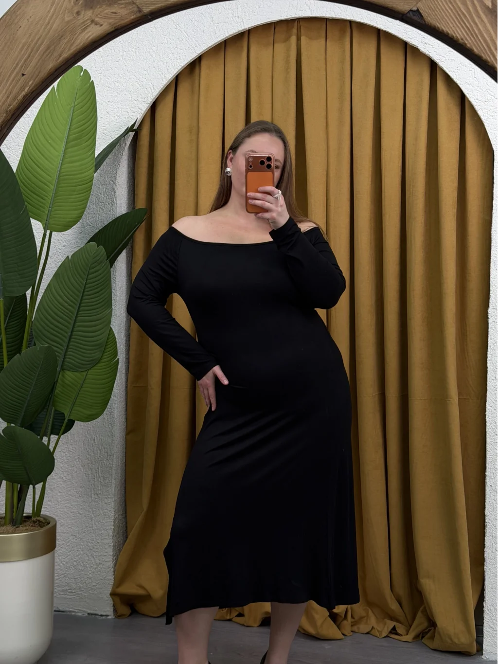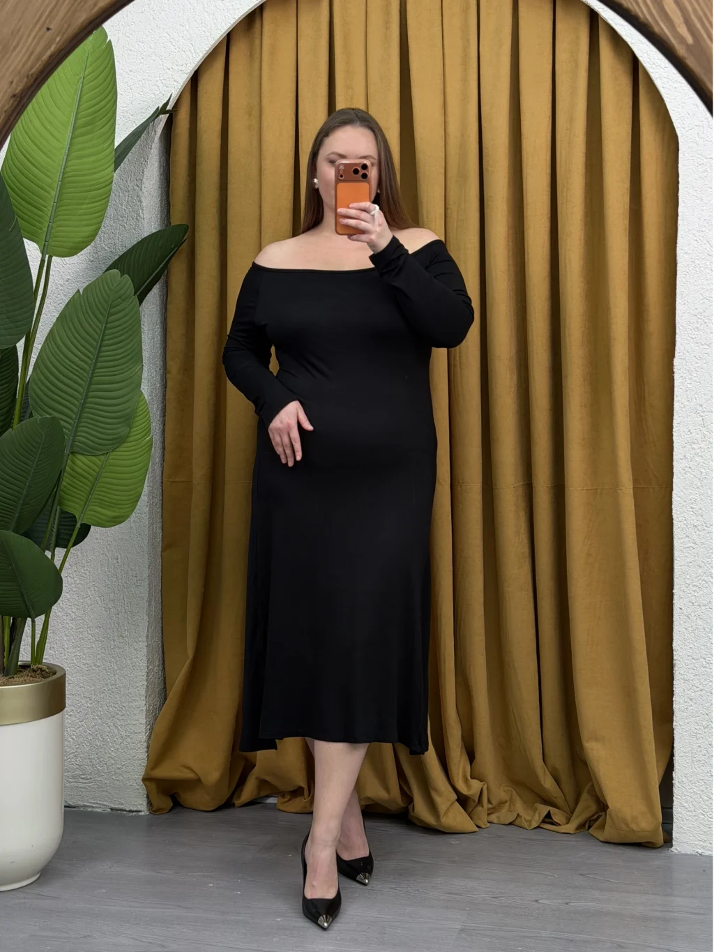 Yırtmaçlı Madonna Yaka Esnek Penye Elbise - Siyah