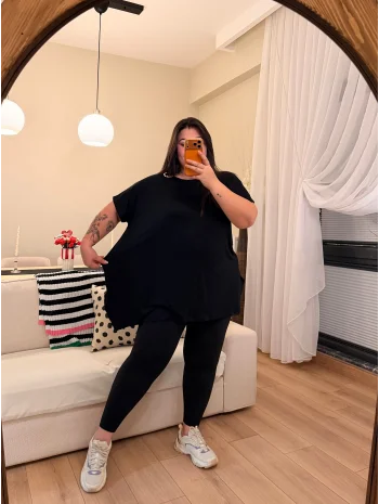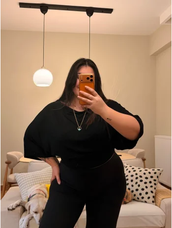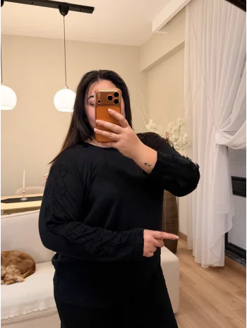Sim Detaylı Geniş Kesim Penye Bluz - Siyah