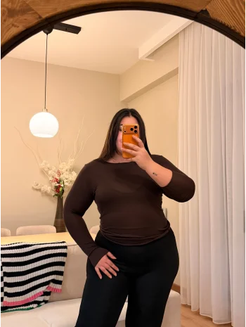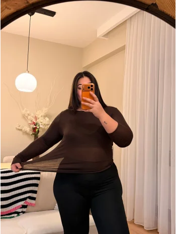Esnek Transparan Dantel Bluz - Kahverengi