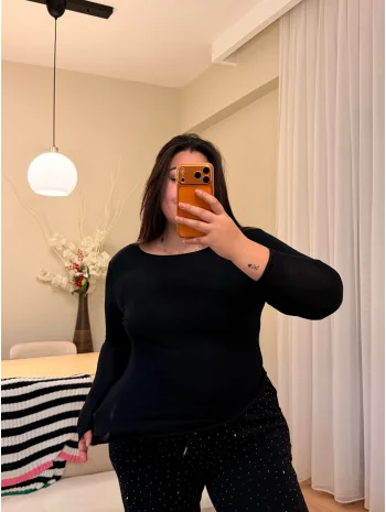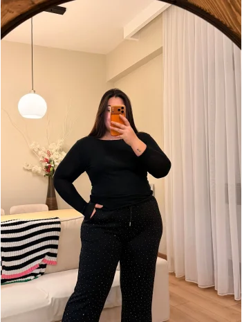 Geniş Kesim Taş Detaylı Penye Bluz - Siyah