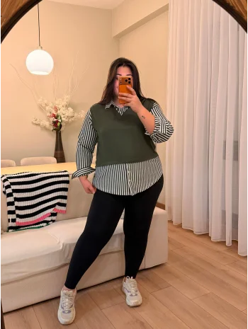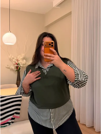 V Yaka Gömlekli Çizgili Modal Bluz - Haki