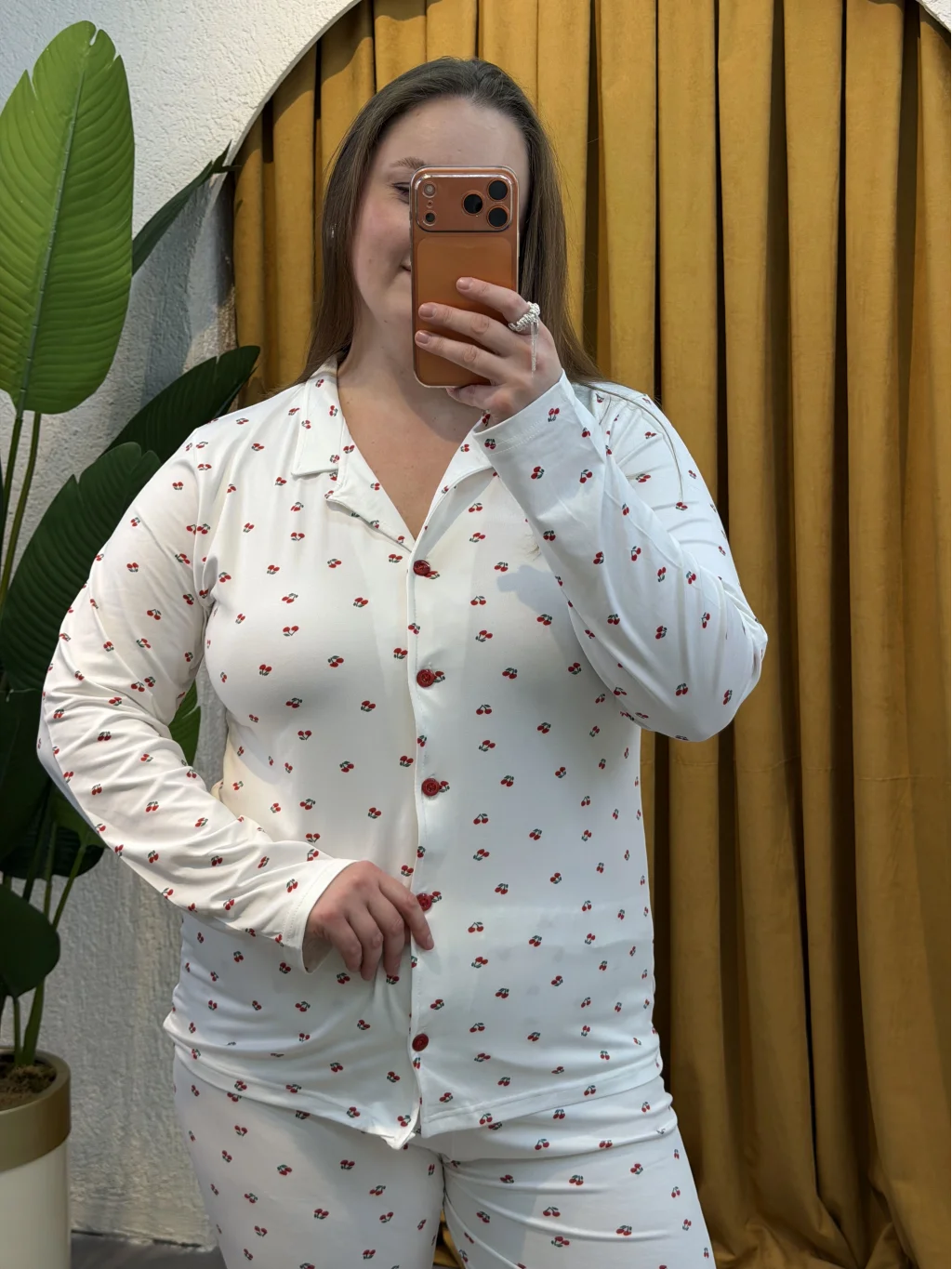 Pastel Butik Düğmeli Esnek Pijama Takımı - Beyaz Kiraz Desenli, rahatlığı ve şıklığı bir arada sunar.