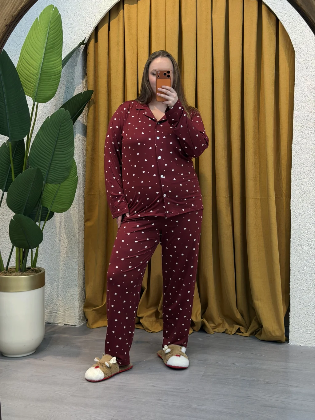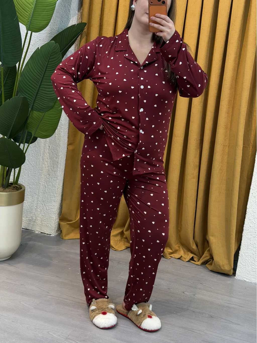 Pastel Butik Düğmeli Esnek Pijama Takımı - Bordo Kalp Desenli, rahatlığı ve şıklığı bir arada sunar.